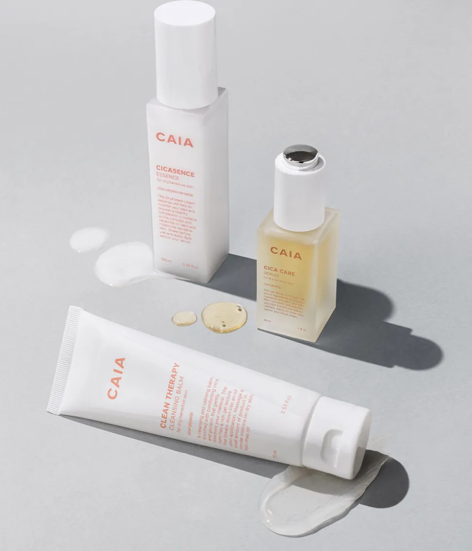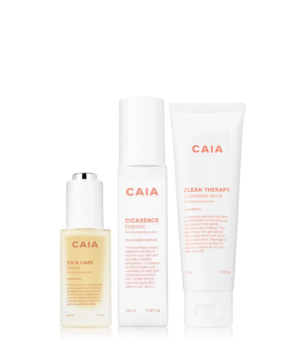 De perfekta produkterna för att lugna och återfukta huden. Clean Therapy cleansing balm avlägsnar skonsamt makeup medan Cicasence är en essens som stärker och ger huden näring. Avsluta med Cica Care serum som återfuktar, lugnar och minskar rodnad.